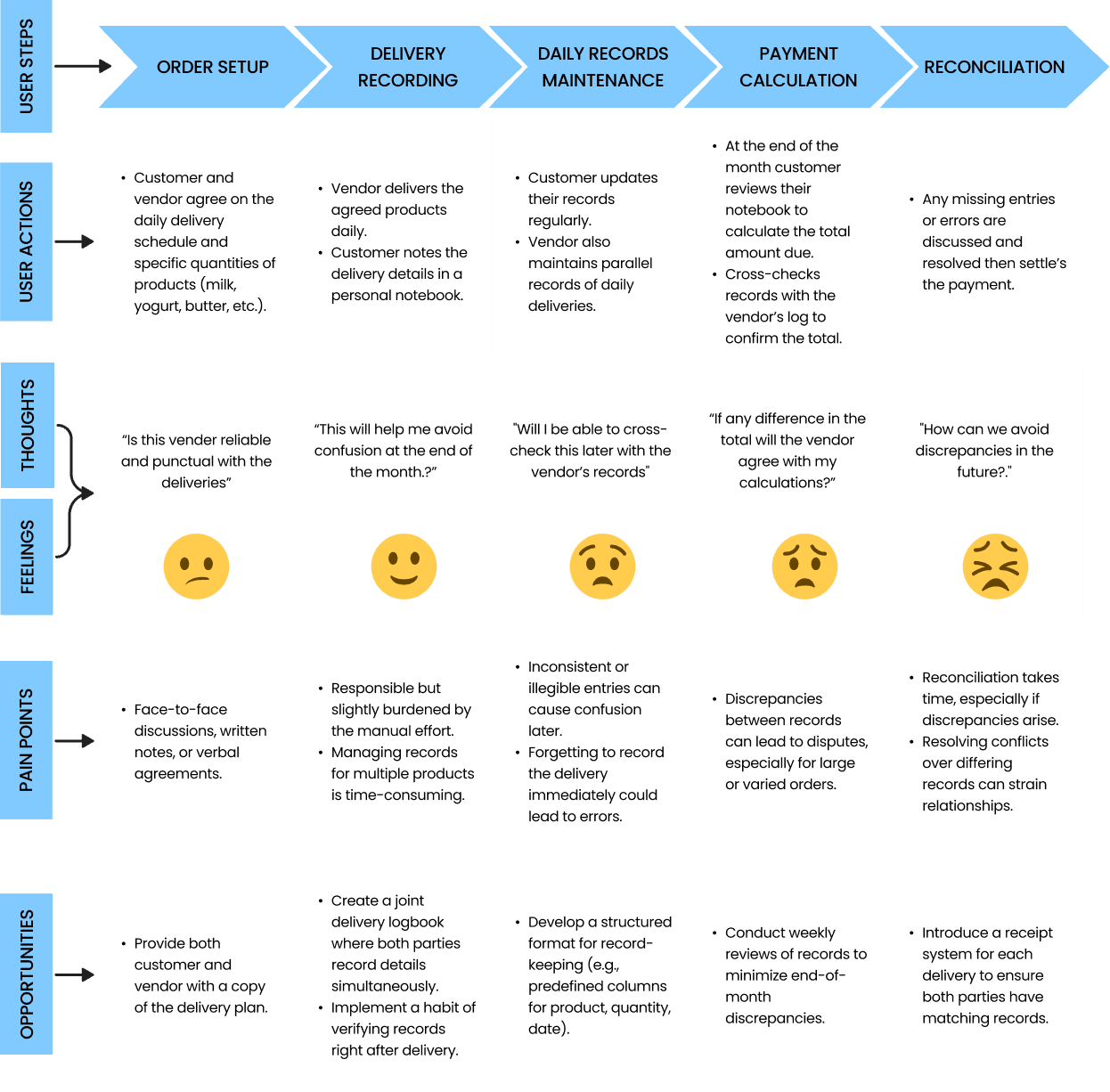 I noticed some issues with records tracking and purchasing dairy products daily, so I conducted surveys and interviews with 36 daily dairy consumers and a couple of sellers to understand the challenges they encounter in buying, selling, and record-keeping. After gathering their responses, I analyzed the information to identify patterns and insights.